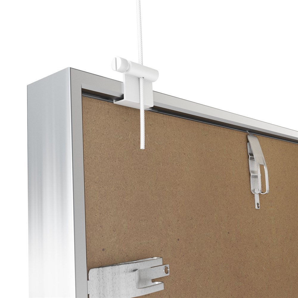 Opphengskrok for aluminiumsrammer i hvit har en ekstra bred overflate som gjør den ideell for å feste aluminiumsrammer og klips-på-bilde-rammer til våre galleriskinner.