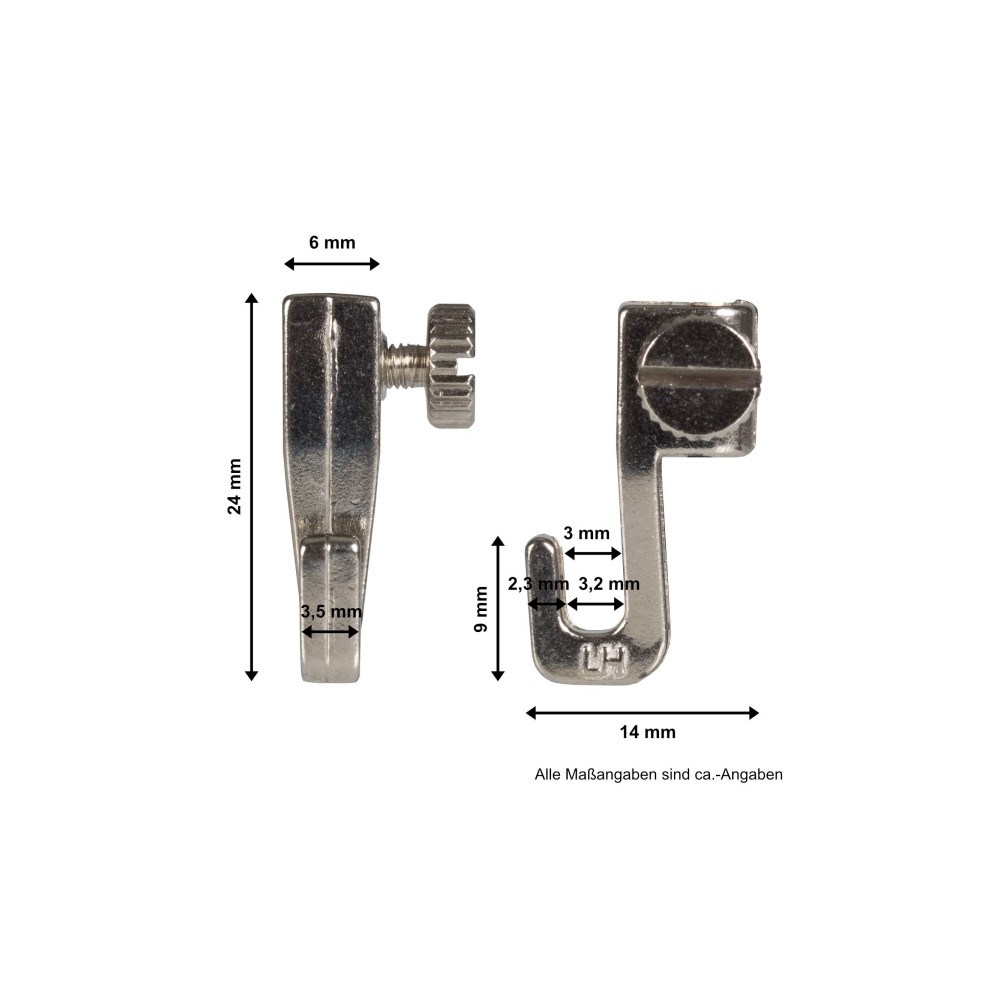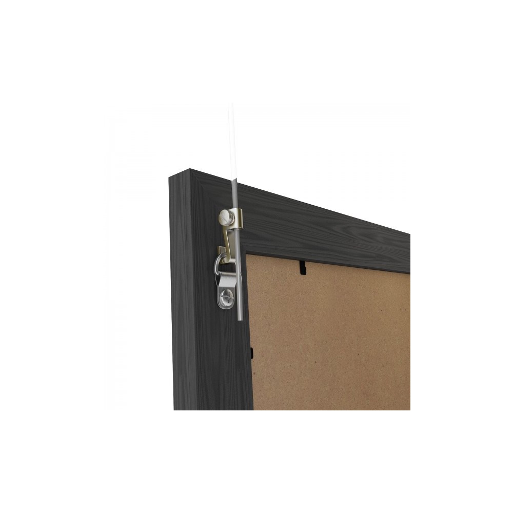 Opphengskroken har en lateral riflet skrue for enkelt å låse den i ønsket posisjon på bildesnoren. Den er ideell for å feste lett til middels belastning på våre galleriskinner.