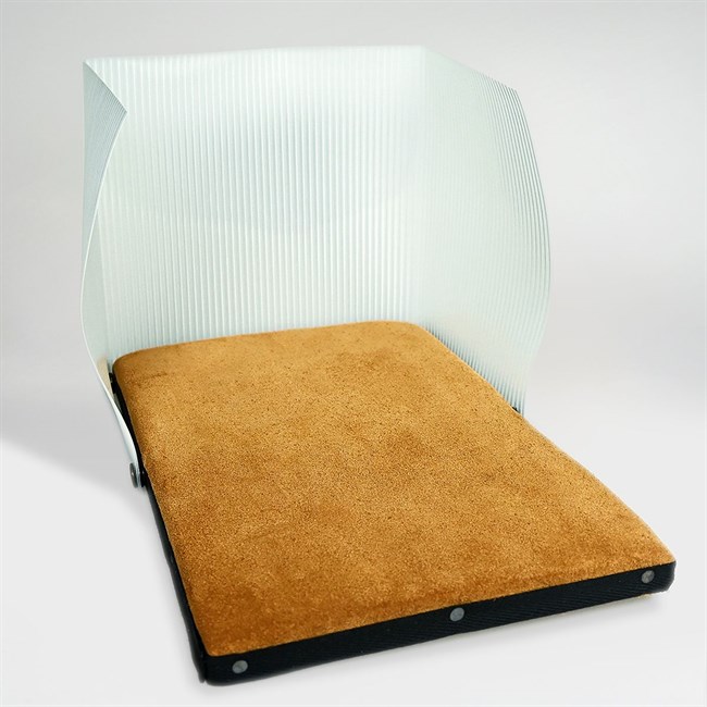 Mykt forgyllingsbrett med avtagbar vindskjerm i fleksibel plastikk. Trukket i mykt kalveskinn, med knivholder og tommetstropp på undersiden.
