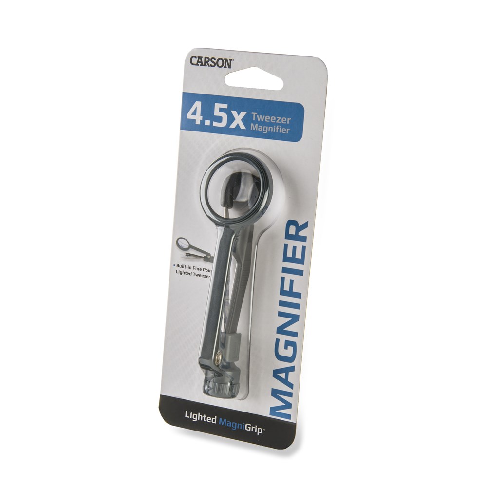 Lighted MagniGrip ™ er en kompakt 4,5x Power 1,1 ″ LED-opplyste forstørrelsesglass med presisjonspinsett.