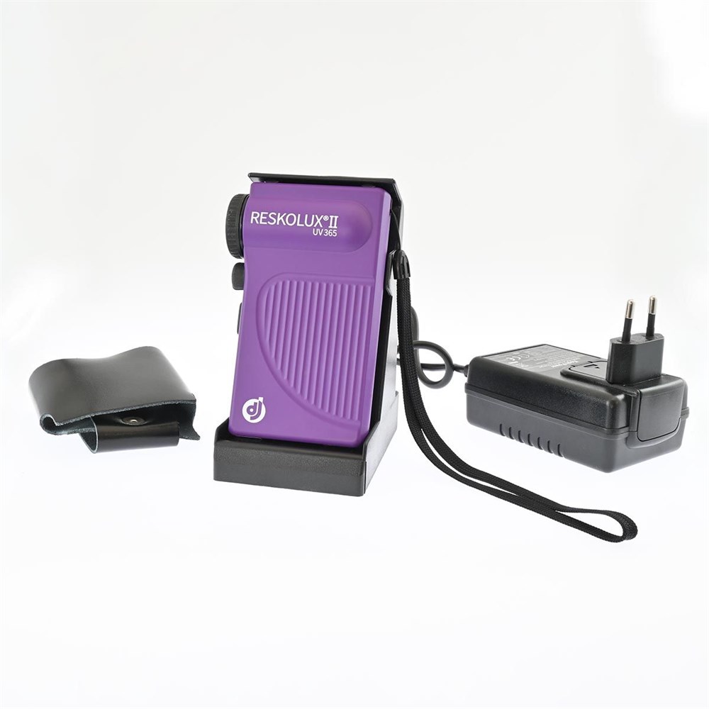 Når du bruker Reskolux® II UV 365 UV-lykt, vennligst bruk UV-bokkerende briller og dekk til hud utsatt for UV-lys ved å bruke hansker eller langermet.